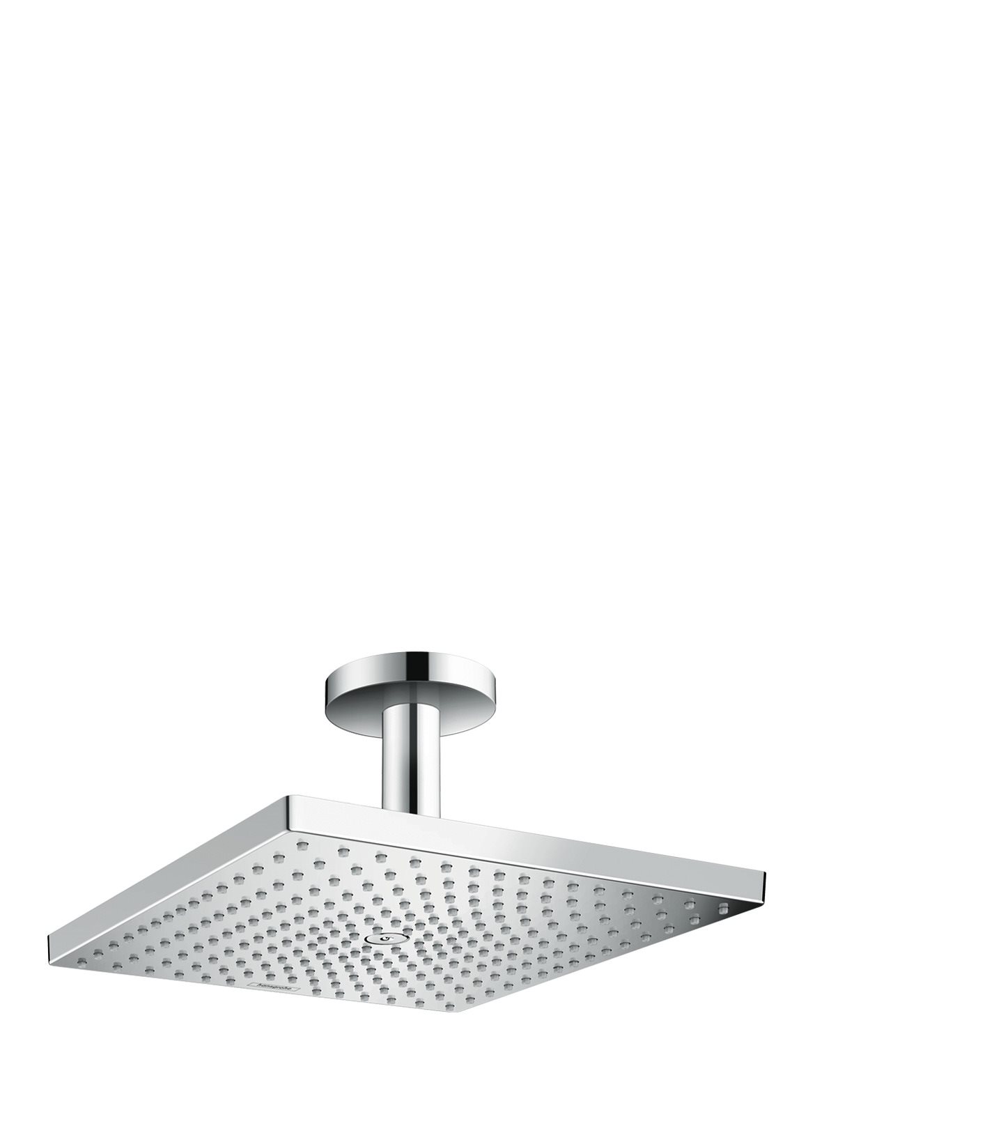 Raindance Select E serien fra tyske hansgrohe er kendetegnet ved dens kvalitet, elegance og kvadratiske design. Hovedbruseren er til montering i loftet og har gummi dupper på dyserne så kalkaflejringer let og enkelt kan fjernes.