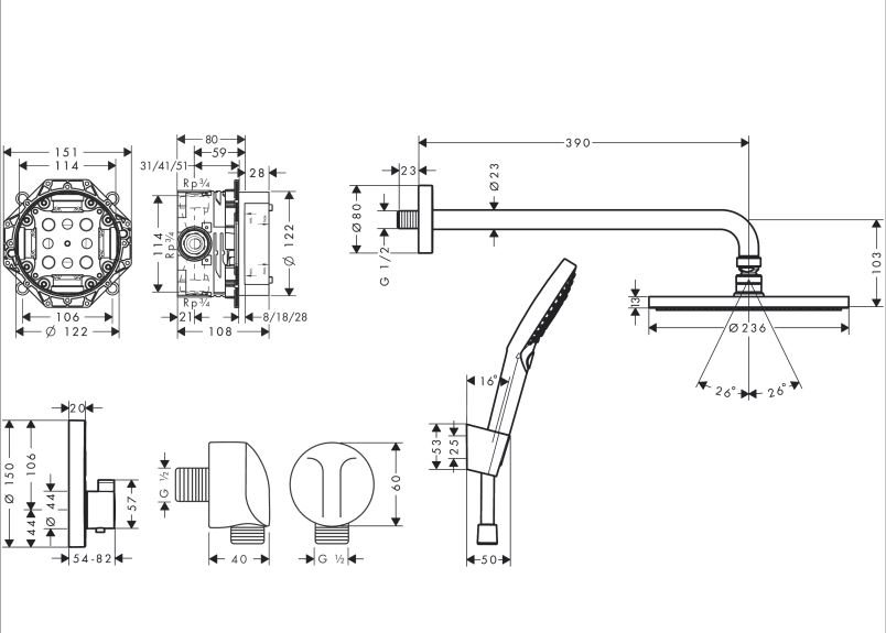 består af: hovedbruser, håndbruser, Termostat, indbygningsdel, slangeudtag, bruserholder, bruserslange