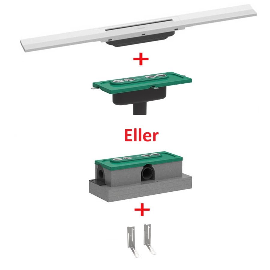 For et komplet hansgrohe RainDrain Flex-afløbsrende til mod bagvæg skal følgende bestilles: