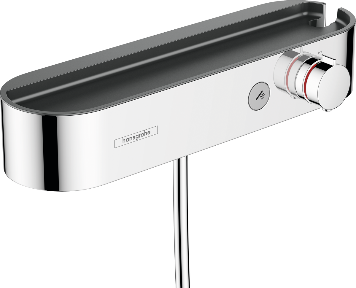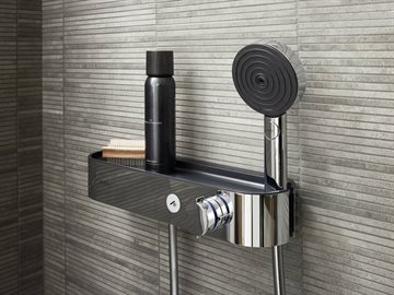 Med hansgrohe ShowerTablet får du et termostatarmatur der placeres helt op ad væggen uden synlige gevind eller rosetter. Armaturets åben og lukke funktionen sker med ét enkelt tryk på Select-knappen med. Den ønskede temperatur indstilles enkelt og præcist på det betjeningsvenlige termostatgreb.