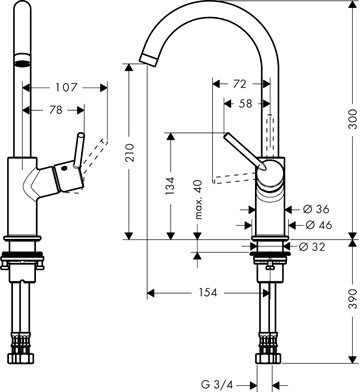 • grebsposition på siden: nederst på armaturkroppen (ikke egnet til bowlevaske)