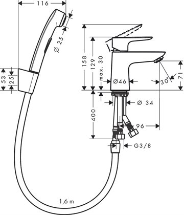 • består af: 1-grebs håndvaskarmatur, bidette-håndbruser, bruserholder, bruserslange, bundventil