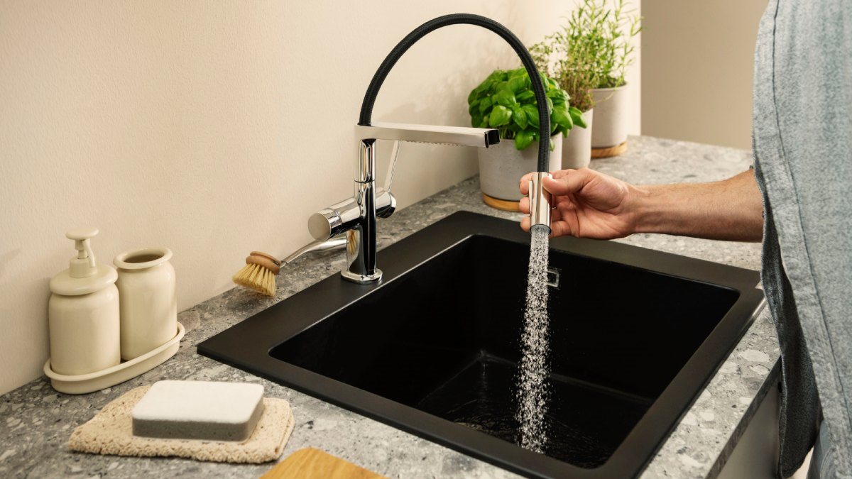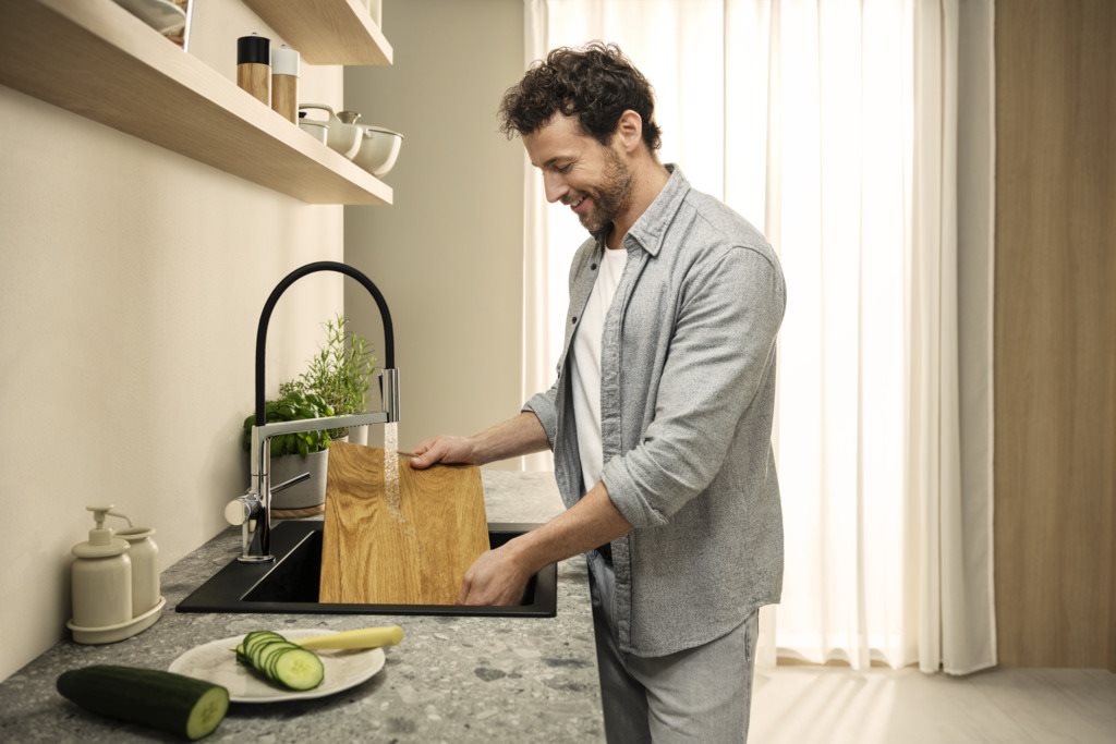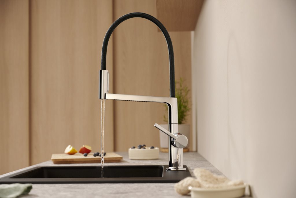 hansgrohe Talis Select M54 3-jet køkkenarmaturet med sin høje runde tud er som skabt til konceptet moderne køkken alrum, der ofte åbent smelter sammen med boligen.