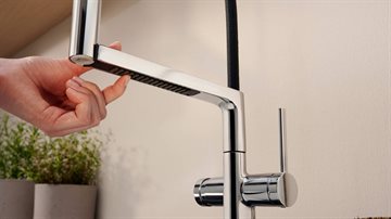 Køkkenvandhanens fleksibel slange og brusehovedet, gør det muligt at udnytte hele køkkenvasken. Strålen kan vinkles og kan dermed komme ud i alle kroge af vasken og med MagFit (den magnetisk bruserholder) holdes brusehovedet fikseret til svingtuden.
