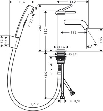 • består af: 1-grebs håndvaskarmatur, bidette-håndbruser, bruserholder, bruserslange