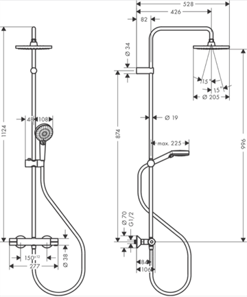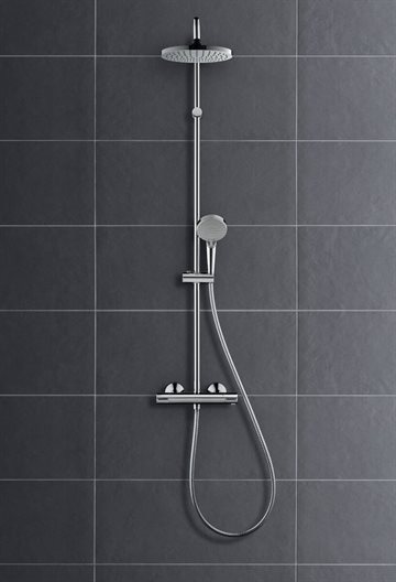 Her får du et komplet hansgrohe brusesystem i flot design og god kvalitet. Brusearmaturet er med termostat og skoldningssikring, der giver tryghed og komfort. Blandingsbatteriets brusersæt består af stort bruserhoved og håndbruser. Her er du garanteret en perfekt bruseoplevelse ved hvert brusebad.