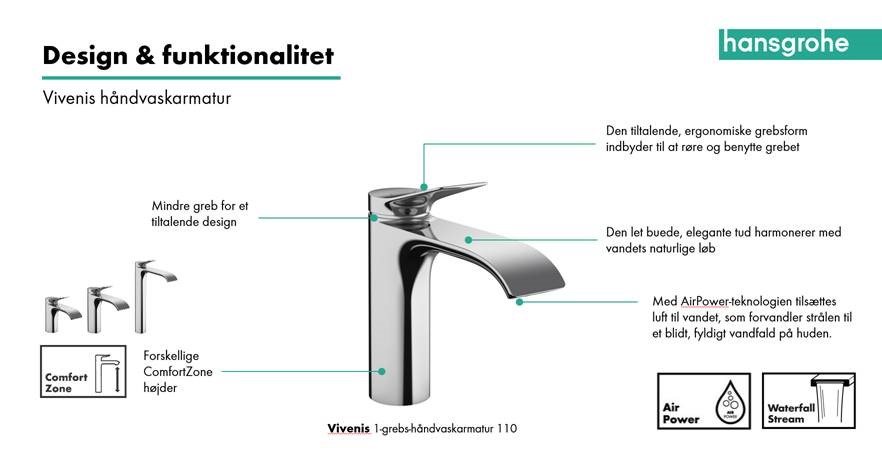 Vandstrålen, som Hansgrohe kalder WaterfallStream, blander vandet med luft og indhyller blidt begge hænder med fløjlsbløde, luftberigede dråber. Tuden og vandet går elegant i ét. De store flader giver vandhanen ekstra kvalitet, og den flade og ergonomiske udformning af grebet giver stor betjeningskomfort.