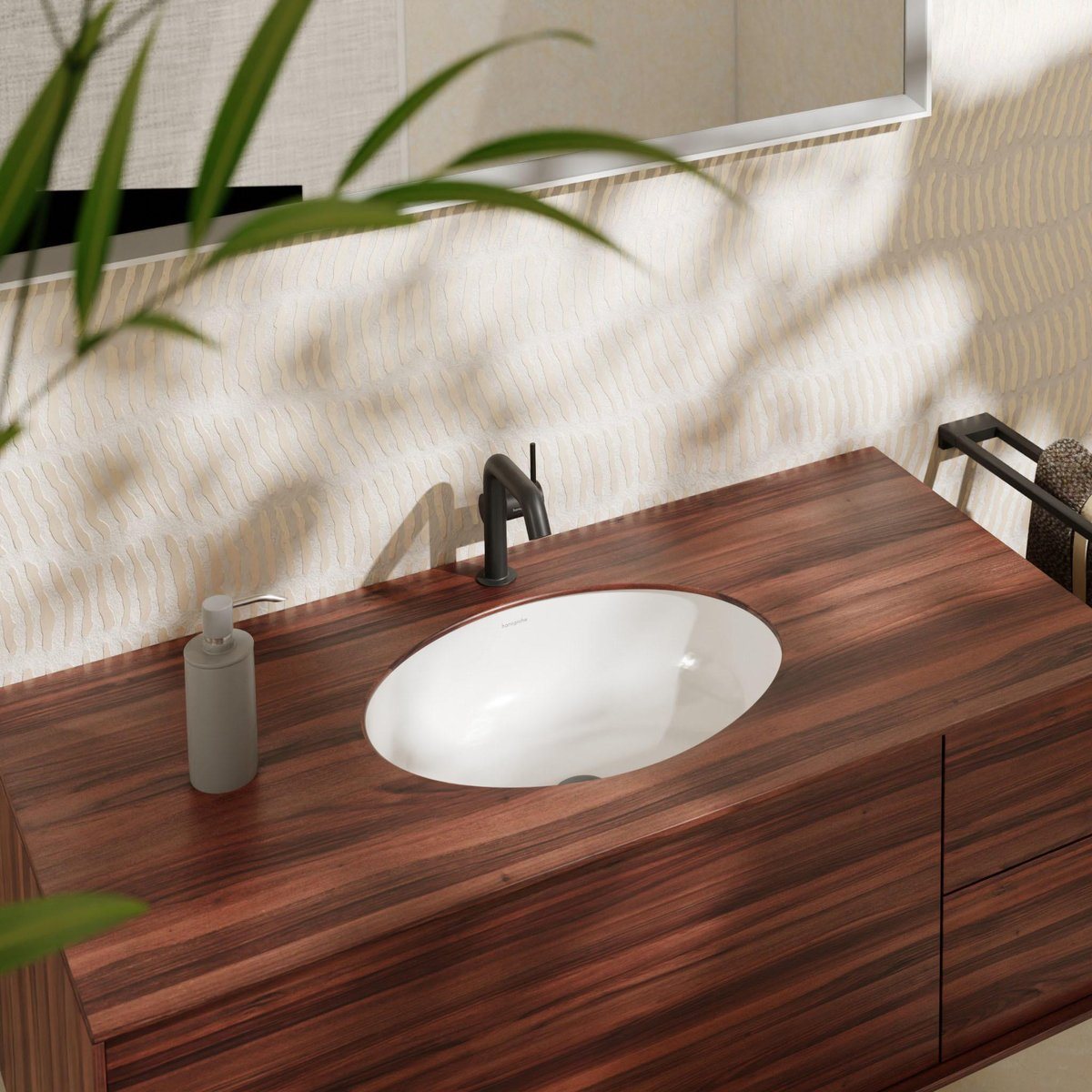 Hansgrohe Xuniva D er en moderne og stilfuld porcelænshåndvask til underlimning, der kombinerer elegant design med praktisk funktionalitet. Denne håndvask er en del af Hansgrohes eksklusive serie af badeværelsesløsninger, hvor kvalitet og æstetik går hånd i hånd.