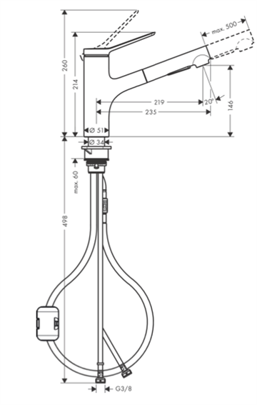 • låsbar brusestråle, strålen stilles tilbage ved at trykke på omskifterknappen og stilles automatisk tilbage, når grebet lukkes