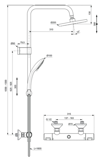 Ideal Standard Idealrain T25 Flex Brusesystem, krom, Ø100 mm håndbruser, 3 strålefunktioner, antikalkdyser, vandbegrænser 8 l/min, 1600 mm Idealflexslange, Ø200 mm hovedbruser, 12 l/min, flex installation: teleskopisk bruserør - 300 mm højdejusterbar, Ceratherm T25 brusetermostat med s-forskruninger og rosetter