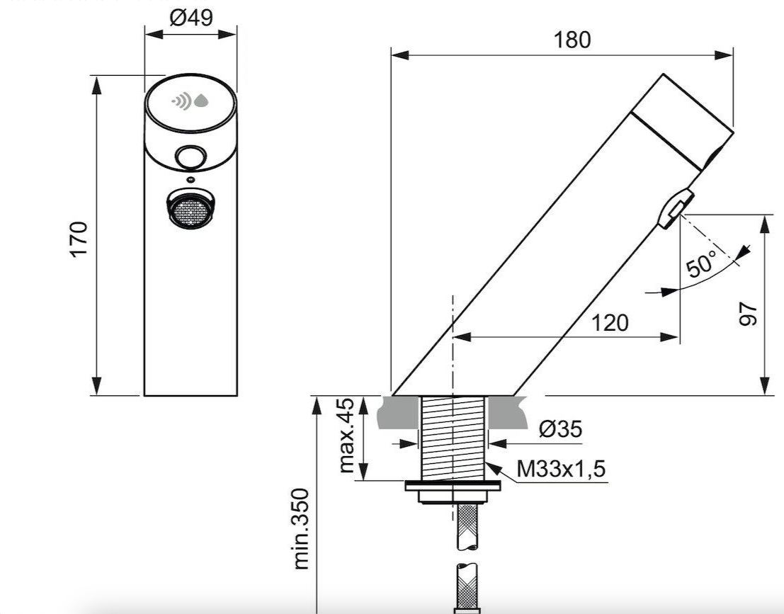 Ideal Standard Sensorflow håndvaskarmatur, Silk Black, elektronisk 6 V, sensor, med blander og temperaturbegrænser, 5 l/min. laminarstråle (ingen luftindblanding), 120 mm tudfremspring, højde 97 mm, tilgang: flexslange G3/8”, uden bundventil.