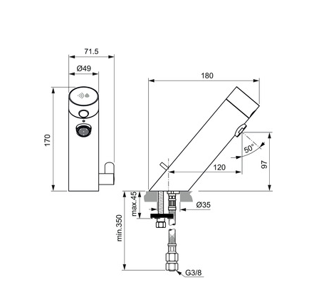 Ideal Standard Sensorflow, Håndvaskarmatur, Silk Black, elektronisk 6V, sensor, med blander og temperaturbegrænser, 5 l/min. laminarstråle (ingen luftindblanding), 120 mm tudfremspring, højde 97 mm, tilgang: flexslange G3/8”, uden bundventil.