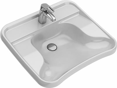 Ifö Care håndvask 65 cm. til bevægelses hæmmede. Velegnet til kørestolsbrugere. Forreste del af vasken er ergonomisk formet med et lavt bassin. Vælg mellem faste eller justerbare bæringer. Uden overløbshul med hanehul.