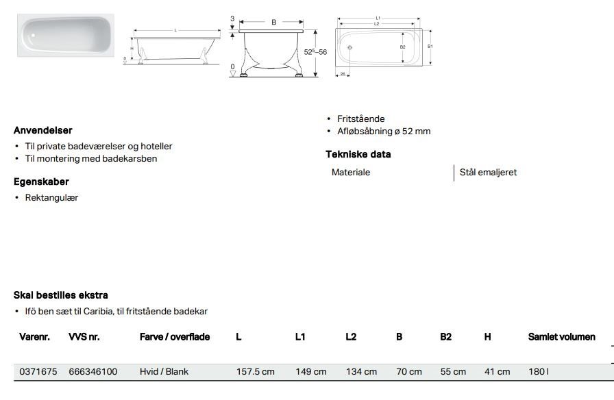 Ifö Caribia fritstående 1570mm badekar hvid bk-pro 16