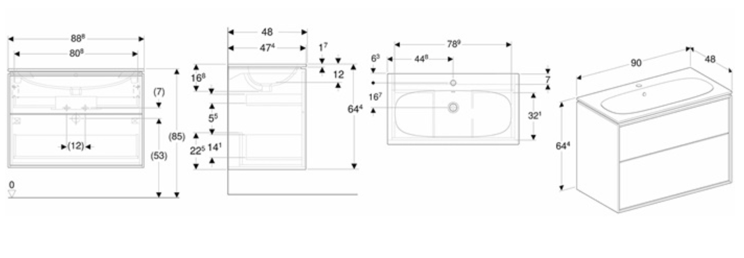 Ifö Sense Art porcelæn håndvask med en kun 1,7 mm kant og underskab med to skuffer med soft close og bløde måtter. Den tynde vask i kombinations med møblet efterlader et meget let og luftigt udtryk, hvor vasken nærmest svæver over underskabet.
