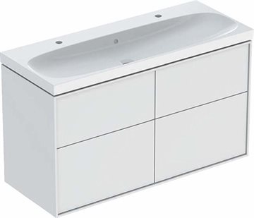 Ifö Sense Art porcelæn håndvask med 2 hanehuller og underskab med fire skuffer med soft close og bløde måtter.