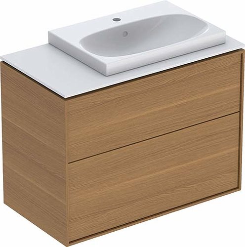 Ifø Sense Art møbelsæt slim 90 cm med 2 skuffer - vask placeret oven på bordplade i højre side, eg natur / melamin træstruktur