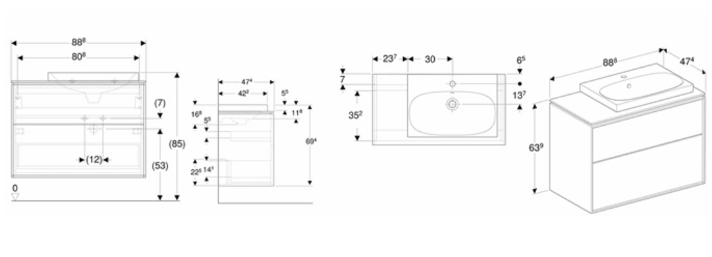 Ifö Sense Art porcelæn håndvask der delvist ligger ovenpå en bordplade (vaskenshøjde er 5,5 cm i forhold til bordpladen) samt underskab med to skuffer med soft close og bløde måtter. Med en vask placeret til højre ovenpå møblet er der masser af fralægningsplads til venstre. For at få fuld udnyttelse af pladsen er der ingen udskæring i skuffen. Dette muliggøres med det medfølgende Special afløb med pungvandlås og push-open bundventil.