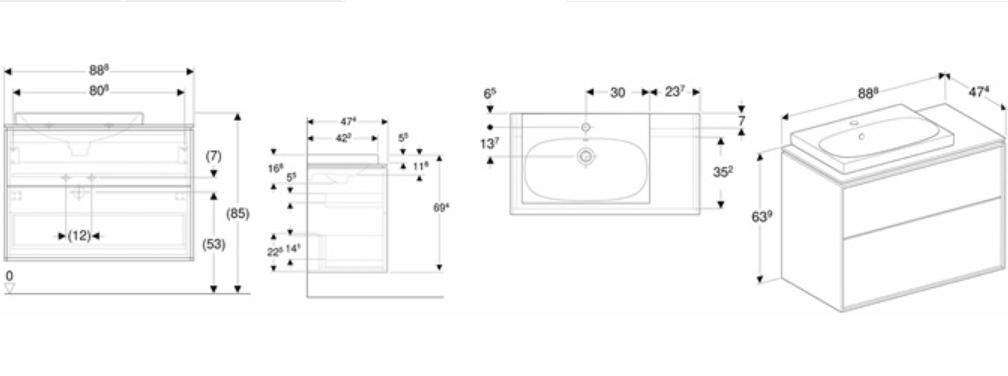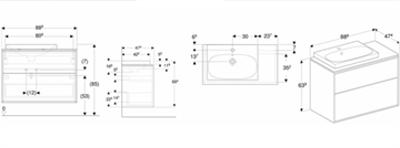 Ifö Sense Art porcelæn håndvask der delvist ligger ovenpå en bordplade (vaskenshøjde er 5,5 cm i forhold til bordpladen) samt underskab med to skuffer med soft close og bløde måtter. Med en vask placeret til venstre ovenpå møblet er der masser af fralægningsplads til højre. For at få fuld udnyttelse af pladsen er der ingen udskæring i skuffen. Dette muliggøres med det medfølgende Special afløb med pungvandlås og push-open bundventil.