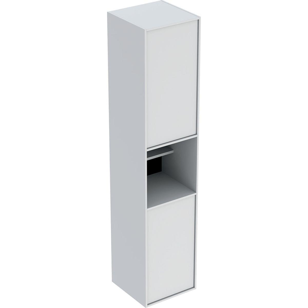 Ifö Sense Art højskab med to lågeog en åben hylde. Lågerne har  soft close beslag og push-open mekanisme. Push-open kan erstattes med et valgfrit greb, som er ekstra tilbehør. Indvendig har højskabet To glashylder og en træhylde.