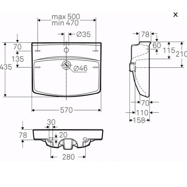 Ifö Spira håndvask 57 cm, lige forkant, montering bolte eller bæringer, med hanehul med overløb.