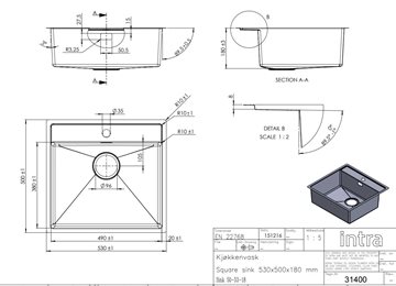 Intra Baltic køkkenvask 490x380 mm med strainer. Til nedfældning