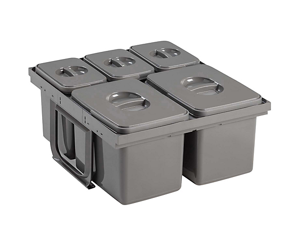 Beregnet til montering i skuffeskab. Beholdere med aftagelige låg og farvede håndtag.