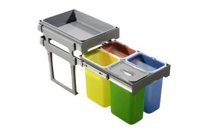 TANK40 affaldssystem, designet i tre forskellige varianter, med praktisk udtræksbakke øverst. Beregnet til montering i køkkenskab. Fås med beholdere i forskellige farver og størrelser, som gør det muligt at tilpasse sorteringen efter individuelt behov.