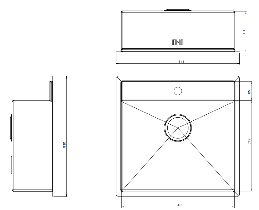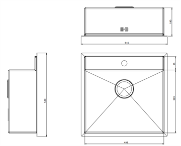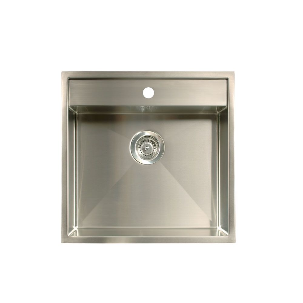 Intra Quadra 500TH køkkenvask. Firkantet køkkenvask, enkelt kumme, til planlimning. Leveres med hanehul for armatur samt strainer og vandlås.