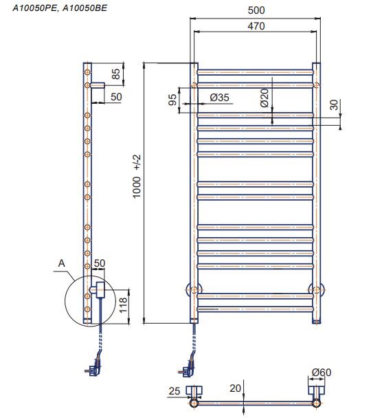 Kriss Apollo El-håndklædevarmer 1000x500 mm børstet rustfrit stål