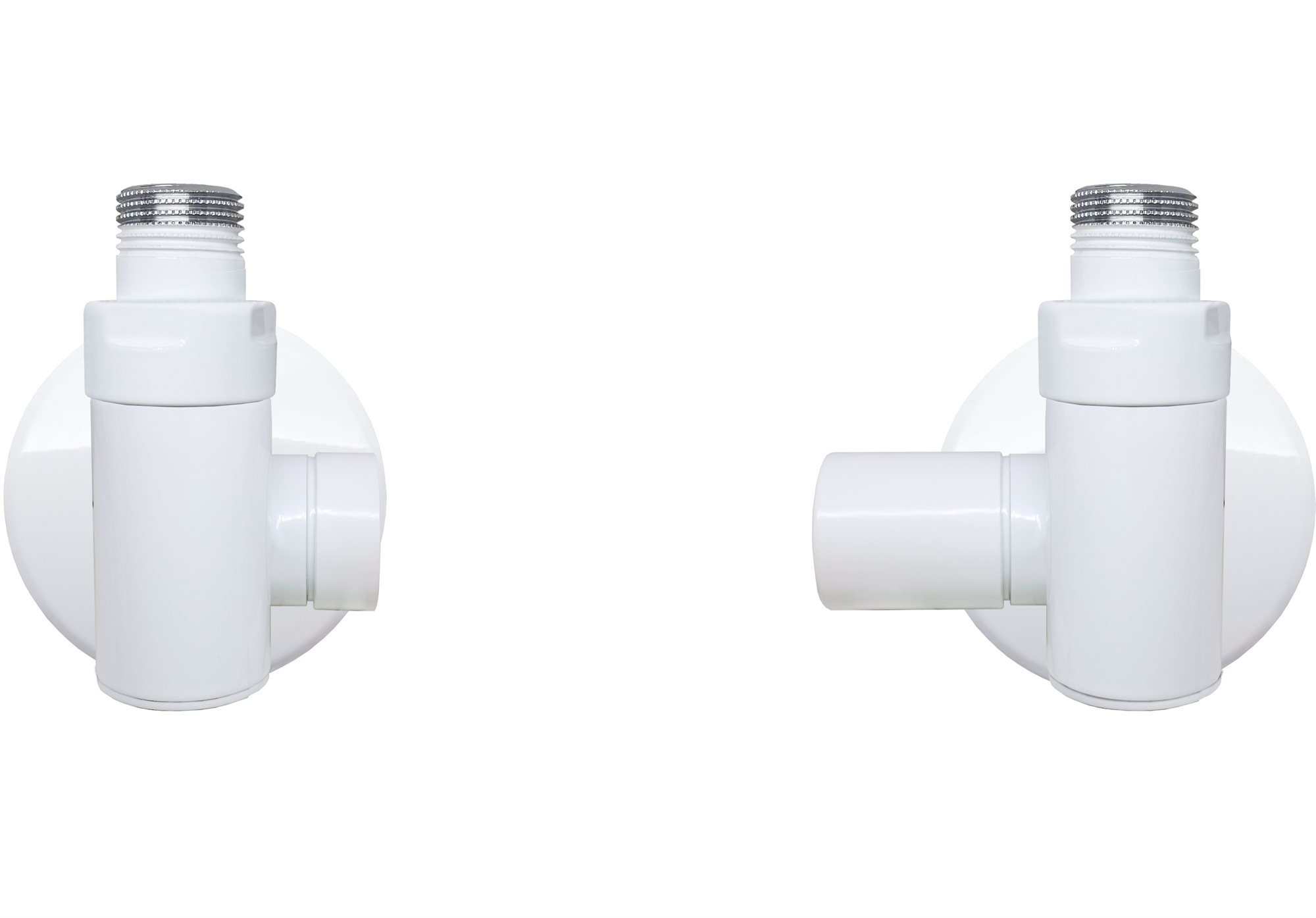 Corner Combi Manuel, ½" vinkelløbende hjørneventilsæt til kombineret central- og elvarme med manuel regulering, lakeret hvid (RAL9016). Ventilsættet er inkl. ½" tilslutningsrør og rosetter. Fremløb i højre side. Regulering skal sidde i højre side. Ikke vendbar.