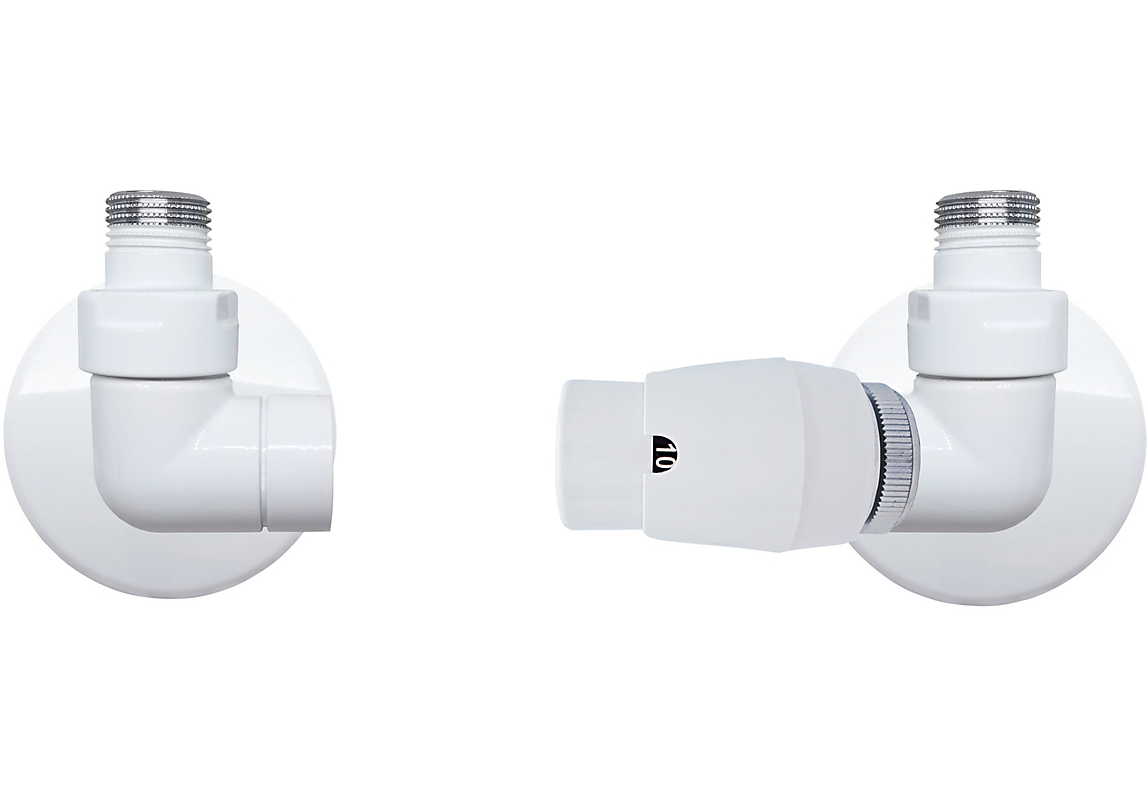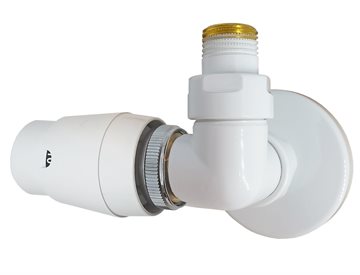 Corner RTL, ½" vinkelløbende hjørneventilsæt med returtermostatføler (RTL), lakeret hvid (RAL9016). Ventilsættet er inkl. RTL føler, ½" tilslutningsrør samt rosetter til væggen – alt i ét varenummer. Fremløb i venstre side. Føler skal sidde i højre side. Ikke vendbar.