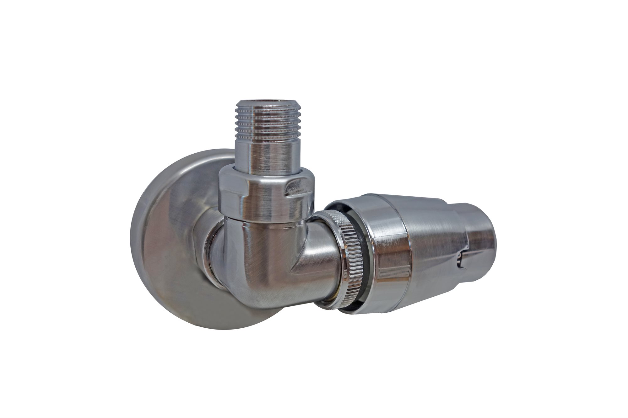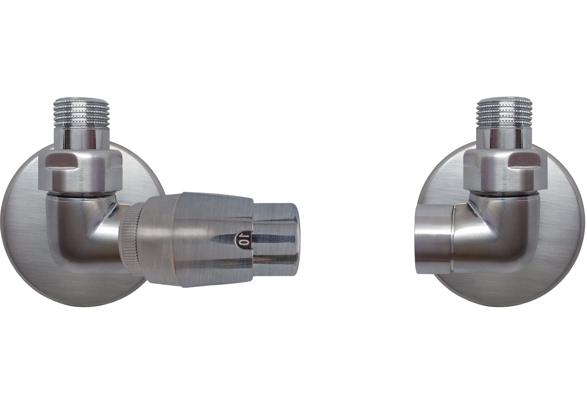 Corner RTL, ½" vinkelløbende hjørneventilsæt med returtermostatføler (RTL), børstet. Ventilsættet er inkl. RTL føler, ½" tilslutningsrør samt rosetter til væggen – alt i ét varenummer. Fremløb i højre side. Føler skal sidde i venstre side. Ikke vendbar.