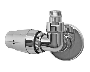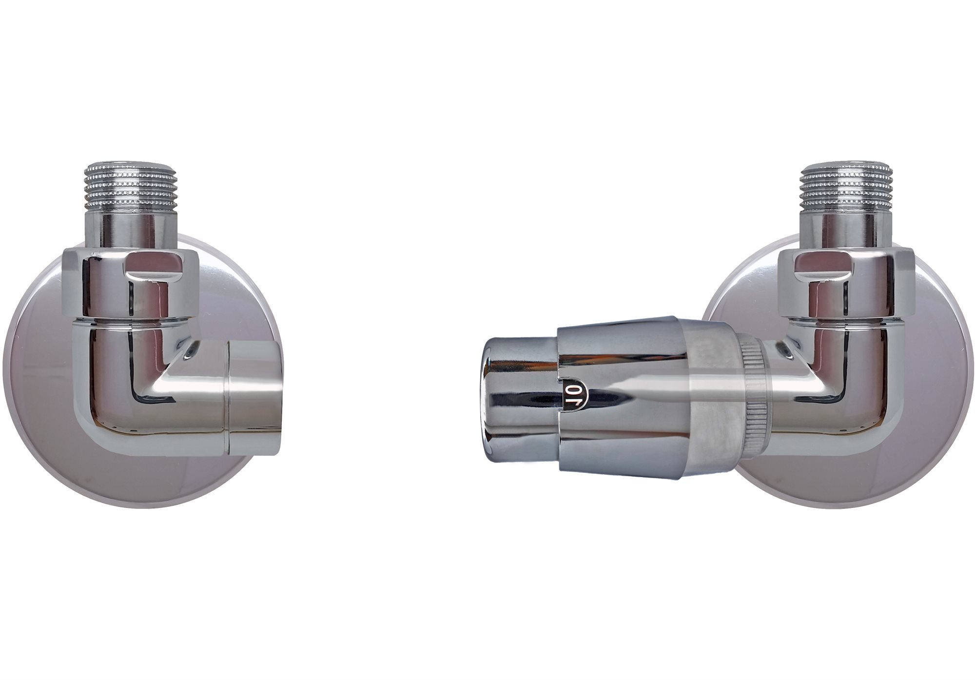 Corner RTL, ½" vinkelløbende hjørneventilsæt med returtermostatføler (RTL), forkromet. Ventilsættet er inkl. RTL føler, ½" tilslutningsrør samt rosetter til væggen – alt i ét varenummer. Fremløb i venstre side. Føler skal sidde i højre side. Ikke vendbar.