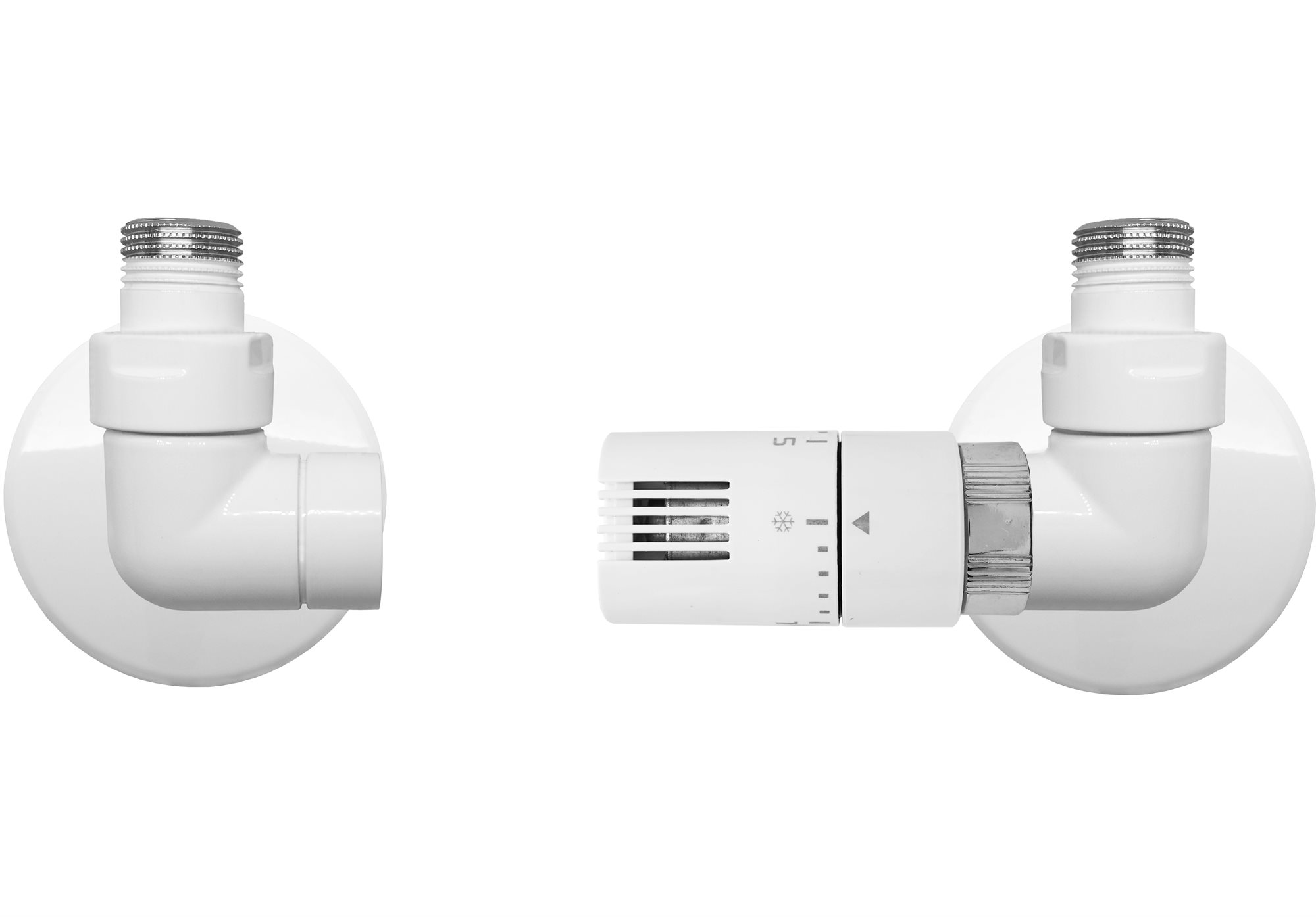 Corner Rum, ½" vinkelløbende hjørneventilsæt med rumtermostatføler, lakeret hvid (RAL9016). Ventilsættet er inkl. føler, ½" tilslutningsrør samt rosetter til væggen – alt i ét varenummer. Fremløb i højre side. Føler skal sidde i højre side. Ikke vendbar.