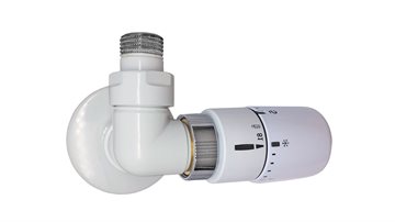 Corner Rum Plus, ½" vinkelløbende hjørneventilsæt med A-klassificeret rumtermostatføler, lakeret hvid (RAL9016). Rumtermostaten er testet af TELL og klassificeret i energiklasse A. Ventilsættet er inkl. føler, ½" tilslutningsrør samt rosetter til væggen – alt i ét varenummer. Fremløb i venstre side. Føler skal sidde i venstre side. Ikke vendbar.