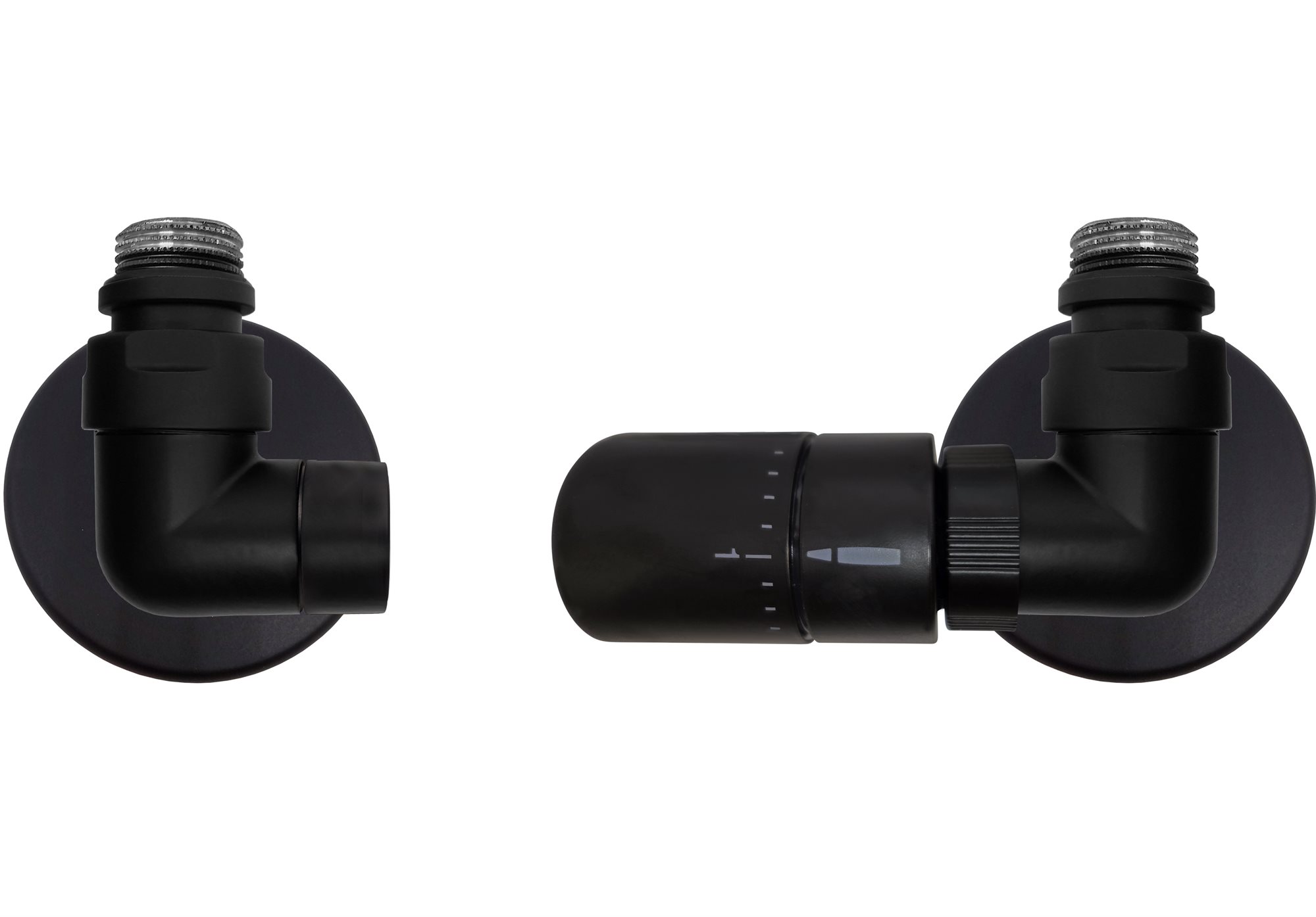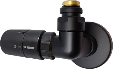 Corner Rum Plus, ½" vinkelløbende hjørneventilsæt med A-klassificeret rumtermostatføler, lakeret matsort (RAL9005). Rumtermostaten er testet af TELL og klassificeret i energiklasse A. Ventilsættet er inkl. føler, ½" tilslutningsrør samt rosetter til væggen – alt i ét varenummer. Fremløb i højre side. Føler skal sidde i højre side. Ikke vendbar.
