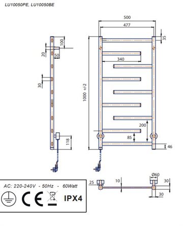 Kriss Luna El-håndklædevarmer 1000x500 mm børstet rustfrit stål