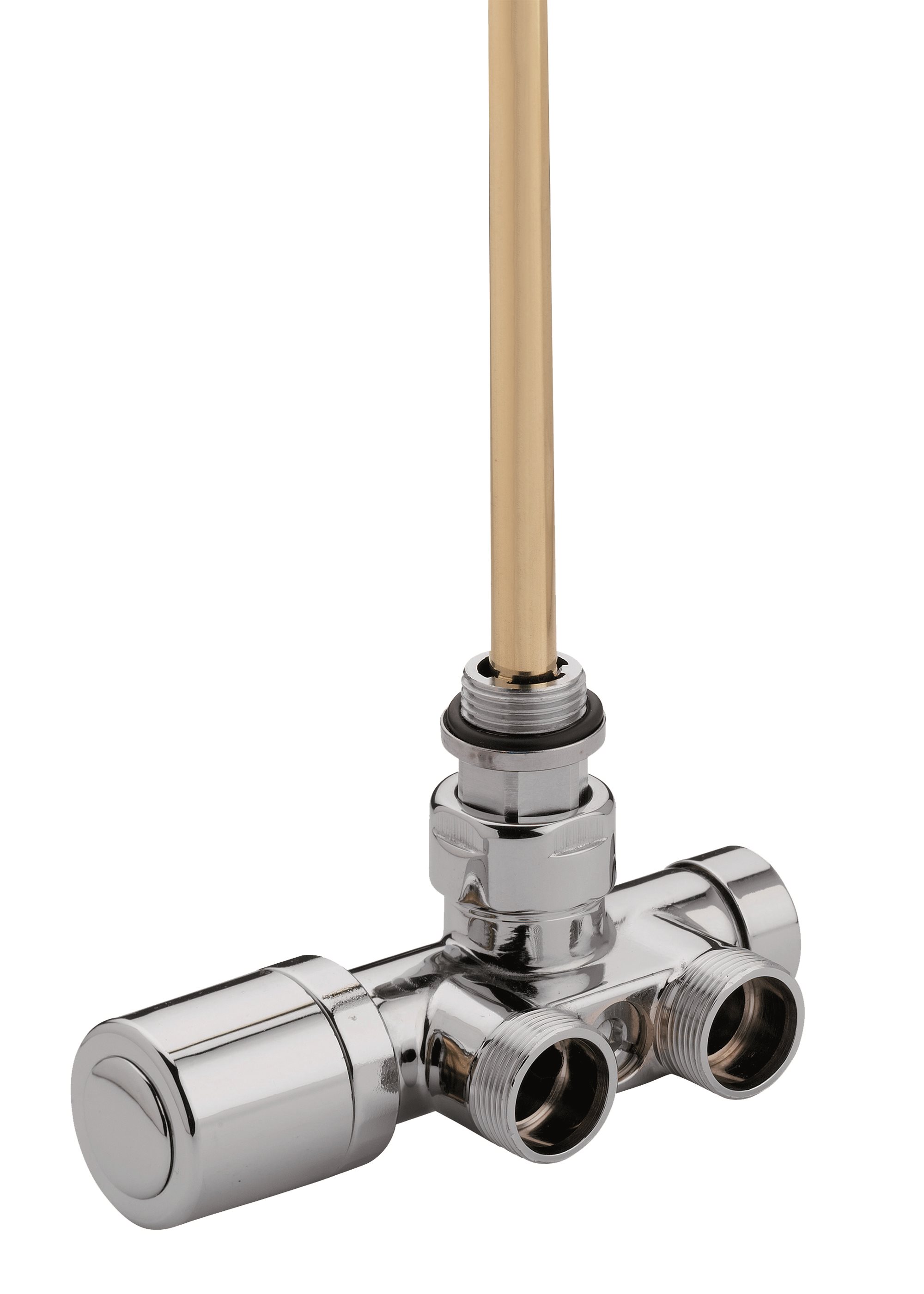 One Manuel, ½" vinkelløbende ventilsæt med manuel regulering til 1- eller 2-rørssystem, forkromet. One leveres inkl. omløber/fittings til 15mm kobberrør. OBS: centerafstanden er 40mm. Fremløb i venstre side. Reguleringen skal sidde i højre side.