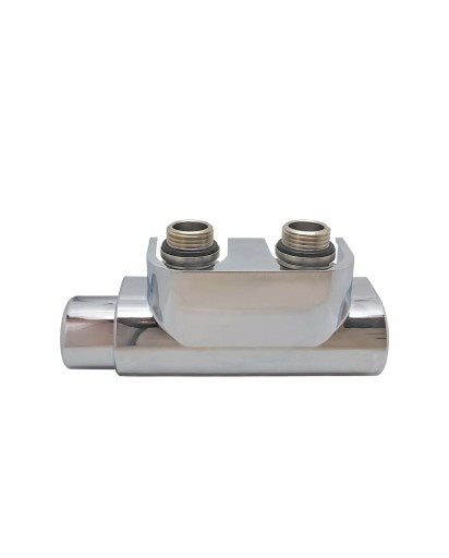 Twin Manuel, ½" vinkelløbende ventilsæt med manuel regulering til 50mm centerafstand, forkromet. Ventilsættet er inkl. front-dækkappe, ½" tilslutningsrør samt rosetter til væggen – alt i ét varenummer. Fremløb i venstre side. Ikke vendbar.