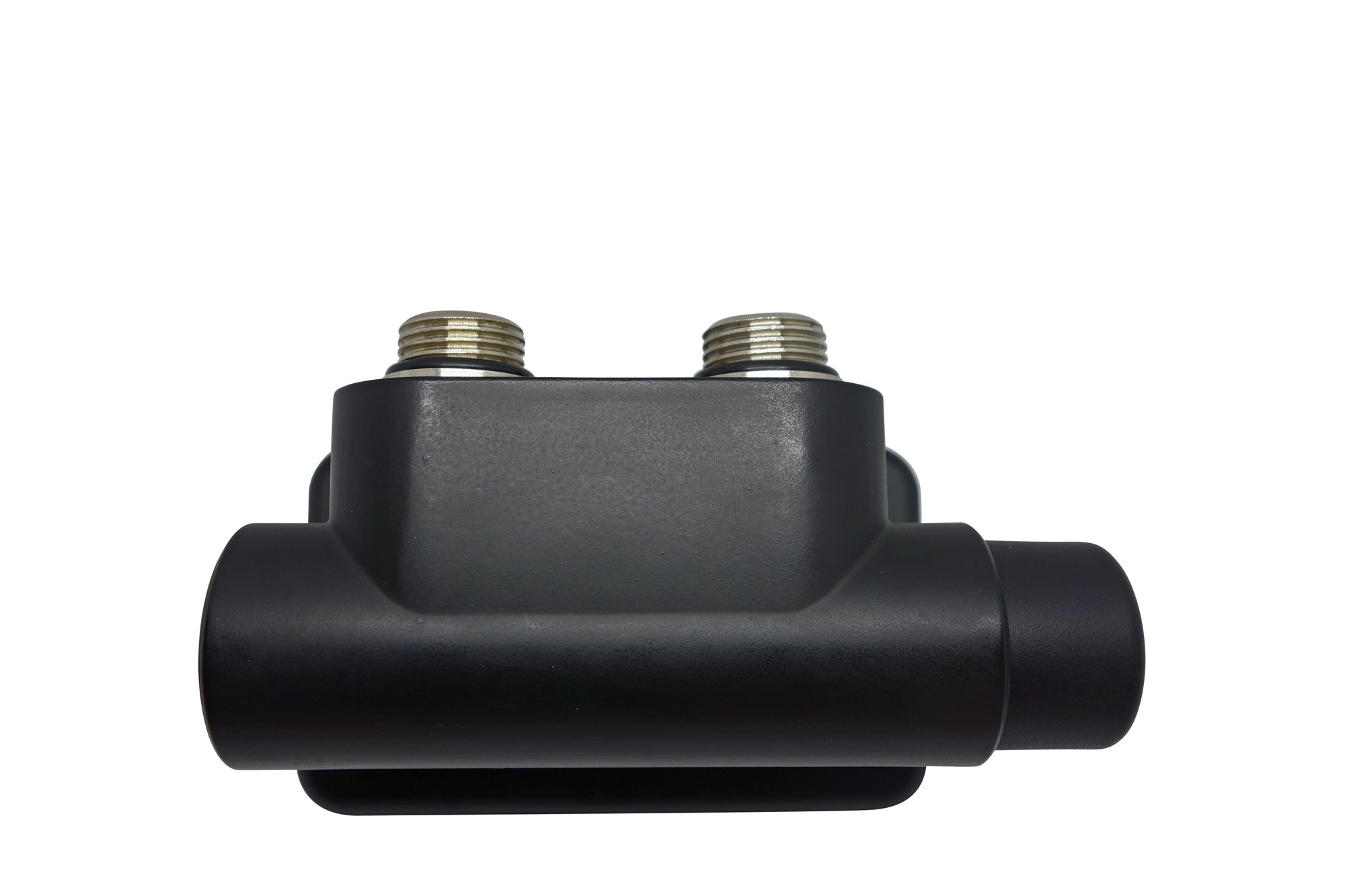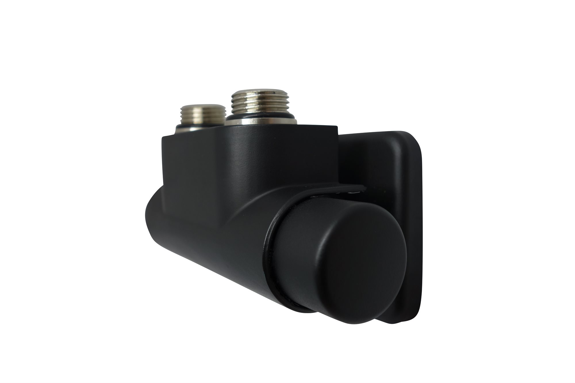 Twin Manuel, ½" vinkelløbende ventilsæt med manuel regulering til 50mm centerafstand, lakeret matsort (RAL9005). Ventilsættet er inkl. front-dækkappe, ½" tilslutningsrør samt rosetter til væggen – alt i ét varenummer. Fremløb i højre side. Ikke vendbar.