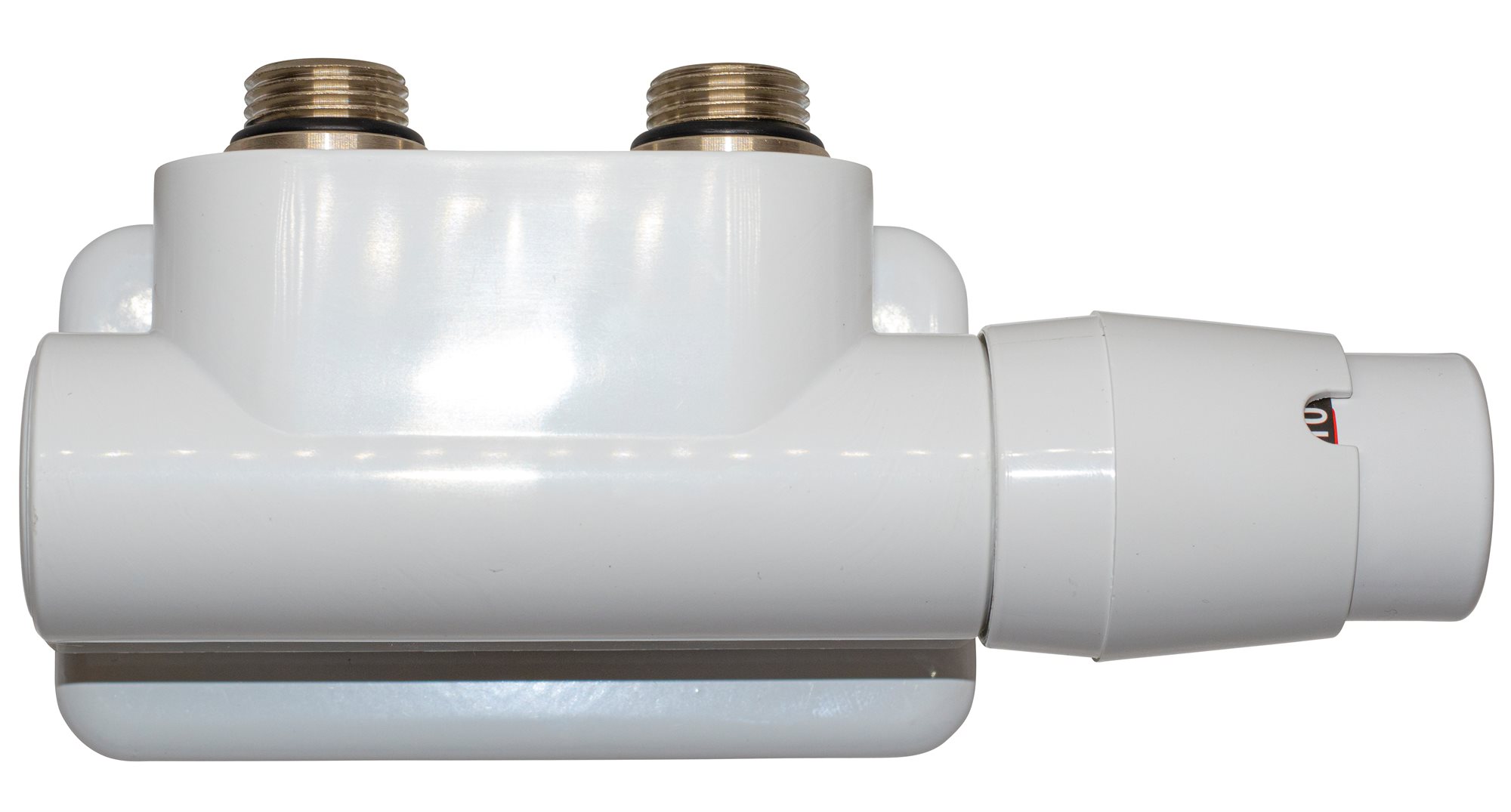 Twin RTL, ½" vinkelløbende ventilsæt med manuel regulering til 50mm centerafstand, lakeret hvid (RAL9016). Ventilsættet er inkl. front-dækkappe, ½" tilslutningsrør samt rosetter til væggen – alt i ét varenummer. Fremløb i venstre side. Ikke vendbar.