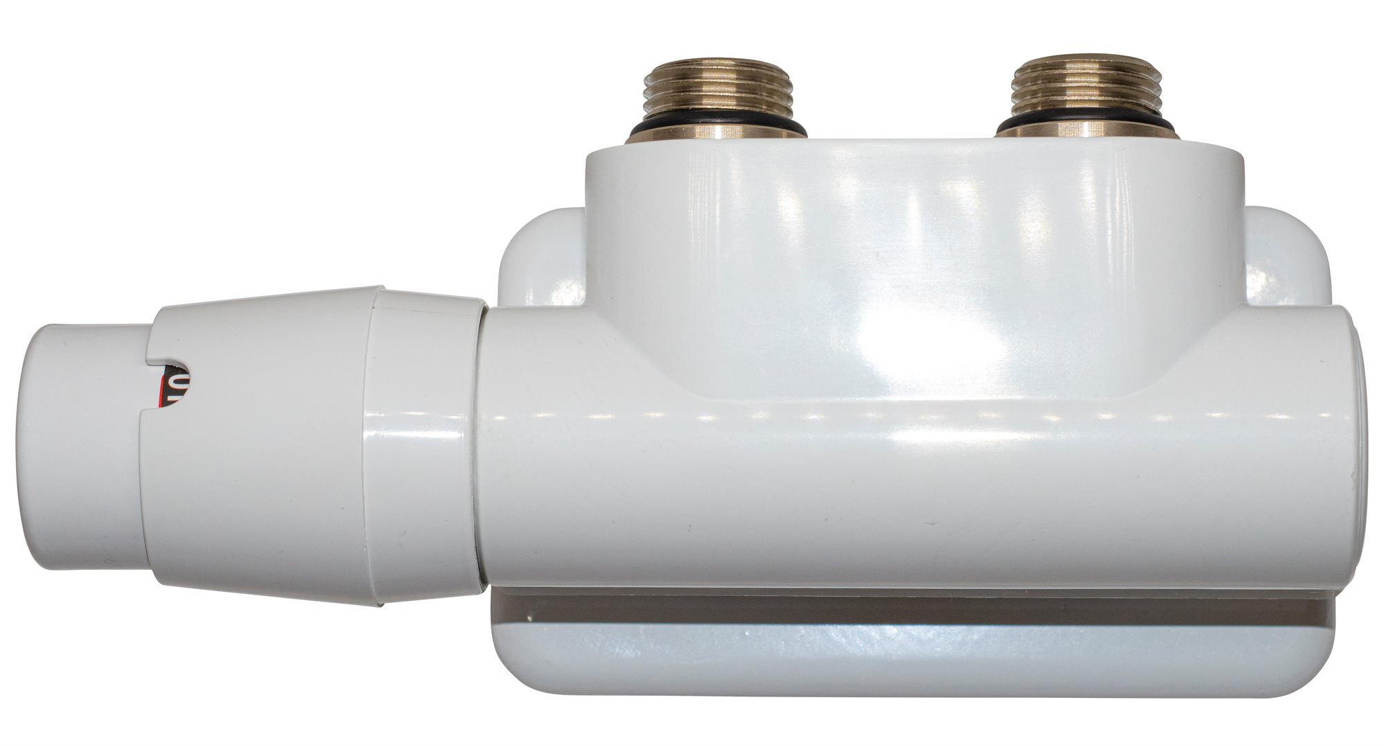 Twin RTL, ½" vinkelløbende ventilsæt med manuel regulering til 50mm centerafstand, lakeret hvid (RAL9016). Ventilsættet er inkl. front-dækkappe, ½" tilslutningsrør samt rosetter til væggen – alt i ét varenummer. OBS: fremløb I højre side. Ikke vendbar.
