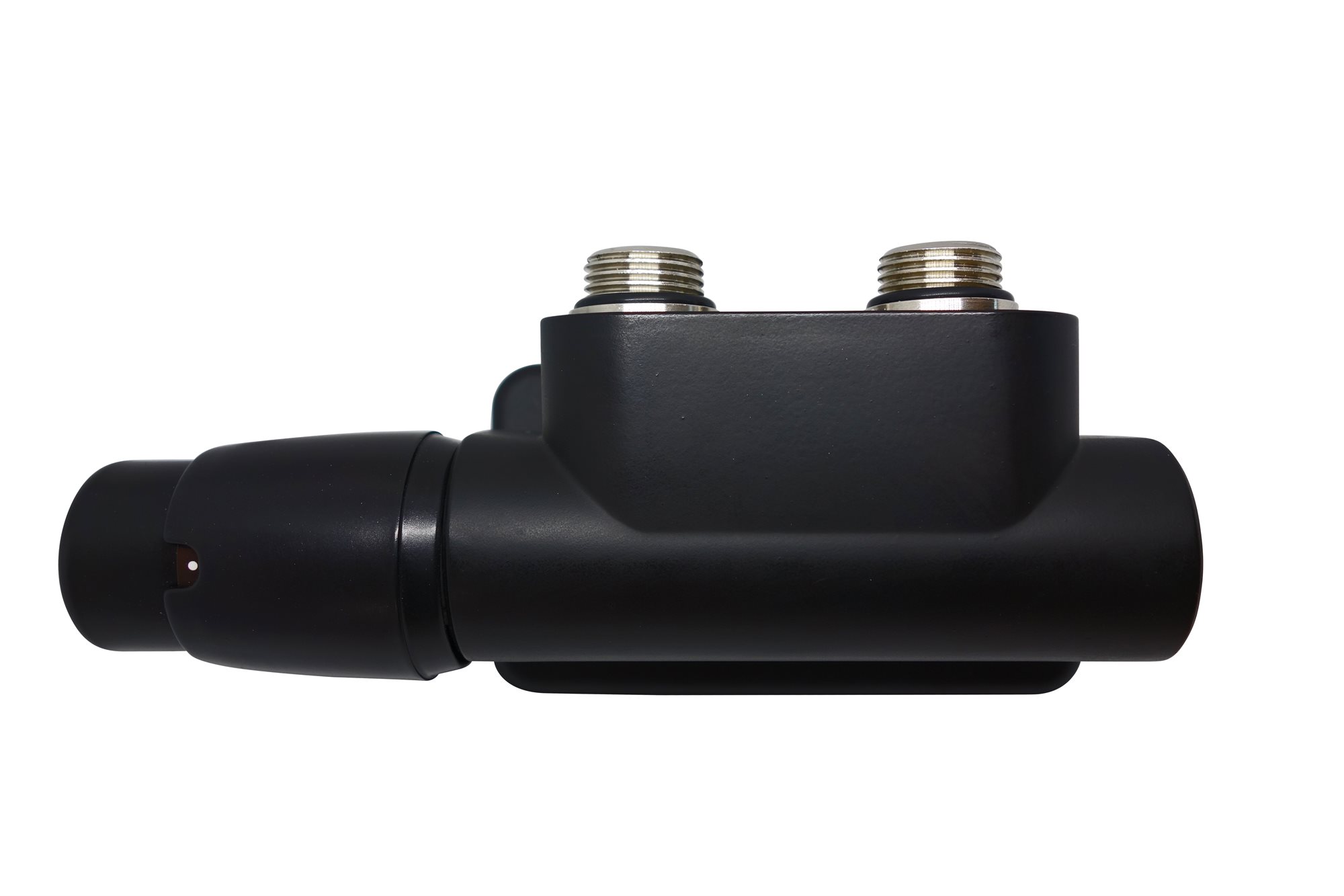 Twin RTL, ½" vinkelløbende ventilsæt med manuel regulering til 50mm centerafstand, lakeret matsort (RAL9005). Ventilsættet er inkl. front-dækkappe, ½" tilslutningsrør samt rosetter til væggen – alt i ét varenummer. Fremløb i højre side. Ikke vendbar.