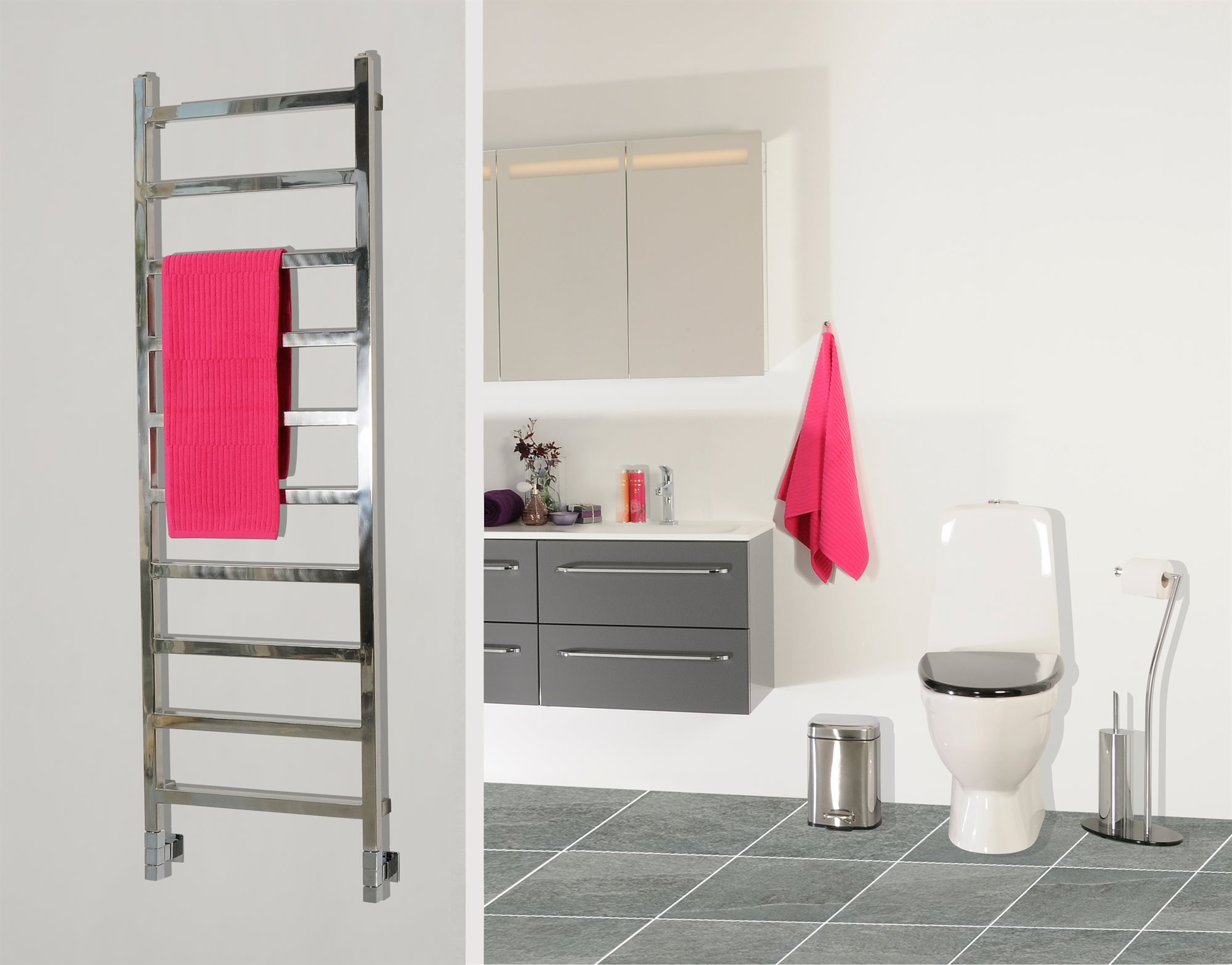 Kriss Upper serien er karakteriseret af usynlige svejsesømme på fronten og det strengt symmetriske design indikerer kreativitet og nytænkning i en stilsikker kombination. De markante snit, hvor de vandrette og lodrette rør har samme dimensioner, giver samtidig Upper håndklædetørreren et enestående og pragtfuldt udtryk.