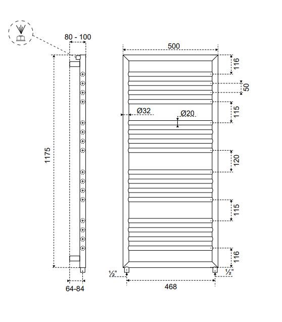 Kriss Venus håndklædevarmer 1175x500mm poleret rustfrit stål