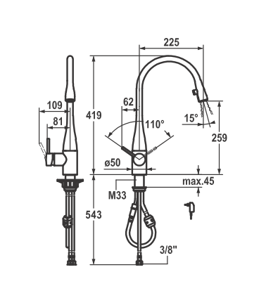 225 mm = Mål: Total højde 420 mm Tudens længde: 225 mm Højde fra bord til udløb: 255 mm