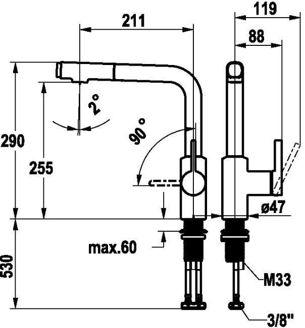 Tilslutningsform: Flexslanger med 3/8" omløbere