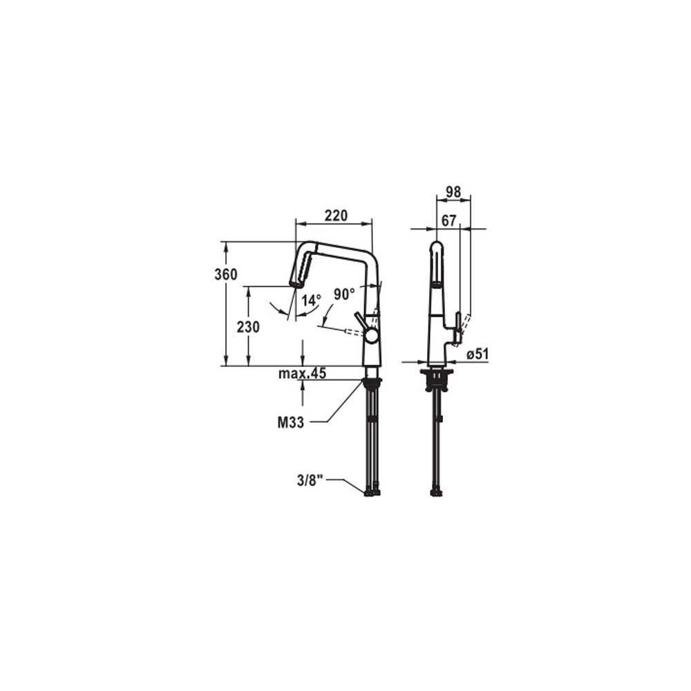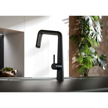 Dette 1-grebs køkkenarmatur med grebet placeret på højreside af kroppen har en svingbar tud 360 grader. Vandhanen leveres med keramisk kartusche. Grebskroppen er isoleret hvorved denne ikke kan blive varm. Vandmængden og temperaturen stilles trinløst.