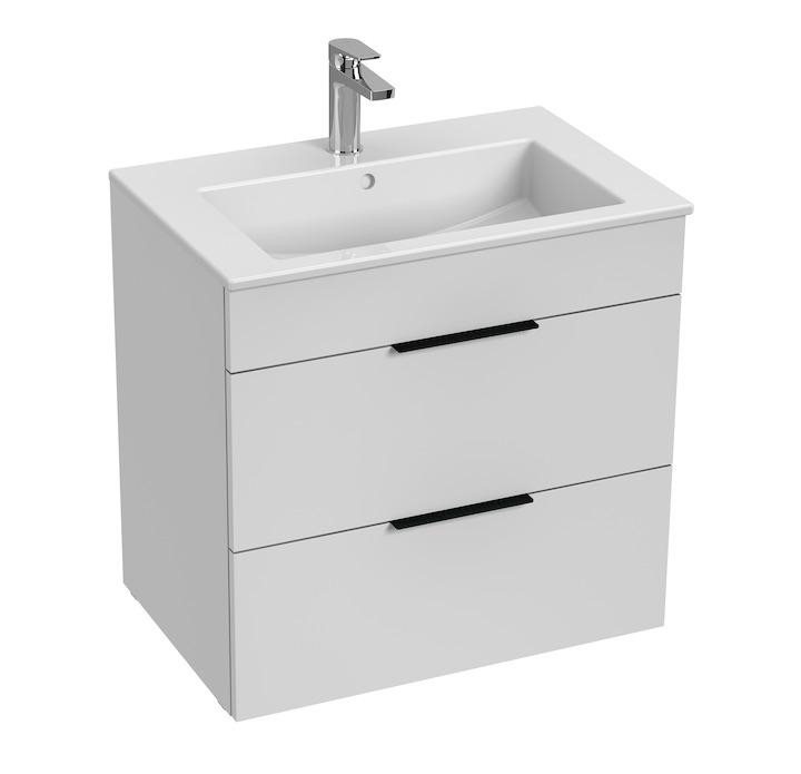Badeværelsesmøblet har halvblank front og mat hvide sider. Skuffegrebene er er sorte.